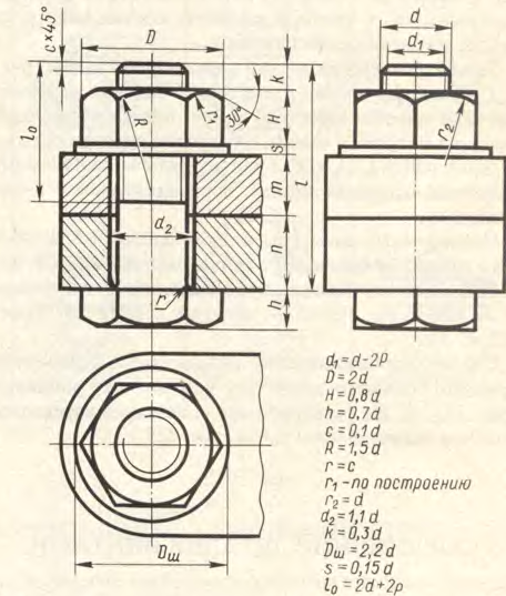 Пpи вычеpчивании болтового соединения констpуктивные pазмеpы болта, гайки и шайбы беpутся из соответствующих стандартов.