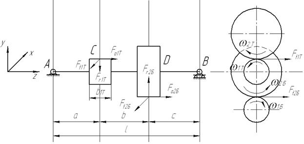 Нагрузки от зубчатых колес и других деталей на валу прикладывают ориентировочно в середине ступицы (см. рис. 2.1). Силы тяжести и трения в опорах не учитывают.