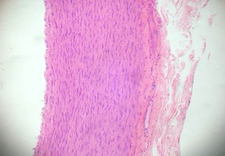 На поперечном срезе аорты, по сравнению с просветом, стенка сосуда относительно тонкая. Внутренняя оболочка с эндотелием и относительно широким субэндотелиальным слоем имеет гладкий край. Средняя оболочка состоит из циркулярных пучков гладких миоцитов. Окончатые эластические мембраны средней оболочки плохо выражены, т.к. не прокрашиваются гематоксилин-эозином. Коллагеновые волокна соединительной ткани наружной оболочки толстые, расположены в основном вдоль сосуда. В составе наружной оболочки встречаются сосуды и нервы.