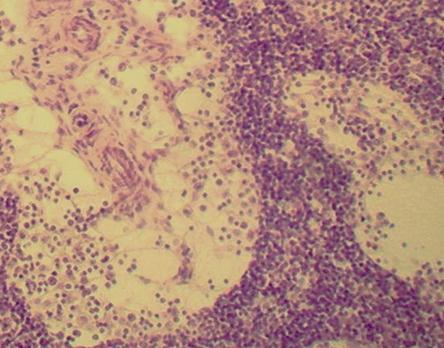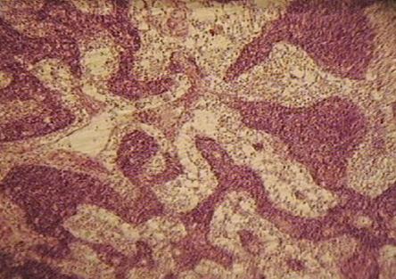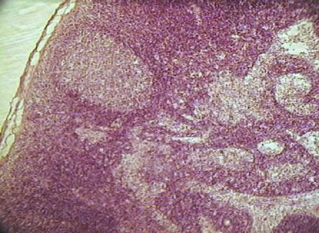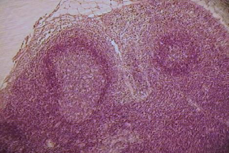 Под соединительнотканной оксифильно окрашенной капсулой узла (плотная неоформленная соединительная ткань) расположены лимфатические фолликулы коркового вещества синего цвета. Большинство фолликулов имеют выраженный светлый центр и более темный венец из лимфоцитов. Центральную часть лимфатического узла занимает мозговое вещество, в котором различают окрашенные базофильно мозговые тяжи – структуры состоящие в основном, из плазматических клеток. Лимфоциты маскируют ретикулярную ткань, ее можно увидеть только в синусах узла при большом увеличении микроскопа. В синусах узла расположено значительное количество клеток: малых лимфоцитов, макрофагов.
