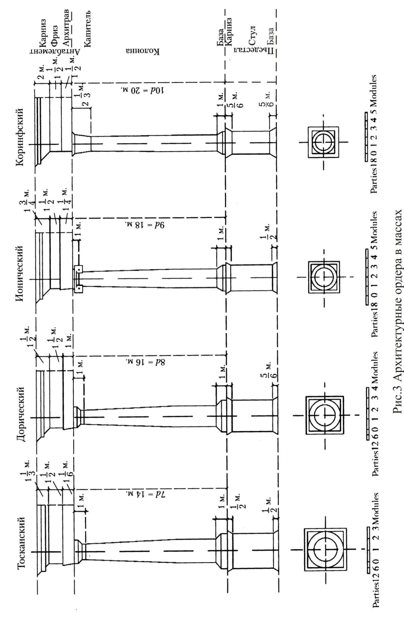 В связи с тем, что основные пропорции композитного ордера такие же, как и коринфского, а по богатству отделки и оригинальности он мало отличается от ионического и коринфского, подробному анализу подлежат четыре ордера – тосканский, дорический, ионический и коринфский (рис.1).