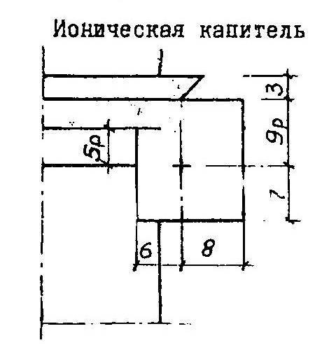 Капитель ионического ордера имеет особые спиральные завитки – ВОЛЮТЫ и сильно отличается от других капителей. Она имеет абак и вал, не имеет шейки, а высота капители равняется 2/3 модуля. Построение ее в массах производится следующим образом. Откладывается общая величина капители – 2/3 модуля, а затем абака – 1/6 модуля. На линии низа капители – на расстоянии I модуля от оси колонны находятся центры волют. Условно волюты изображаются в виде прямоугольника. При этом соблюдаются величины удаления сторон прямоугольника от центра волюты: по вертикали вверх – 9 парт, вниз – 7 парт; по горизонтали дальше от оси колонны – 8 парт, ближе к оси – 6 парт. При весьма незначительном модуле допускается волюты изображать в форме квадрата со стороной, равной одному модулю (рис. 4,а).