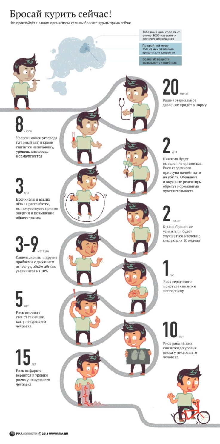 | Бронхиолы в ваших легких расслабятся, вы почувствуете прилив энергии и повышение общего тонуса. | Никотин будет выведен из организма. Риск сердечного приступа начнёт идти на убыль. Обоняние и вкусовые рецепторы обретут нормальную чувствительность. |