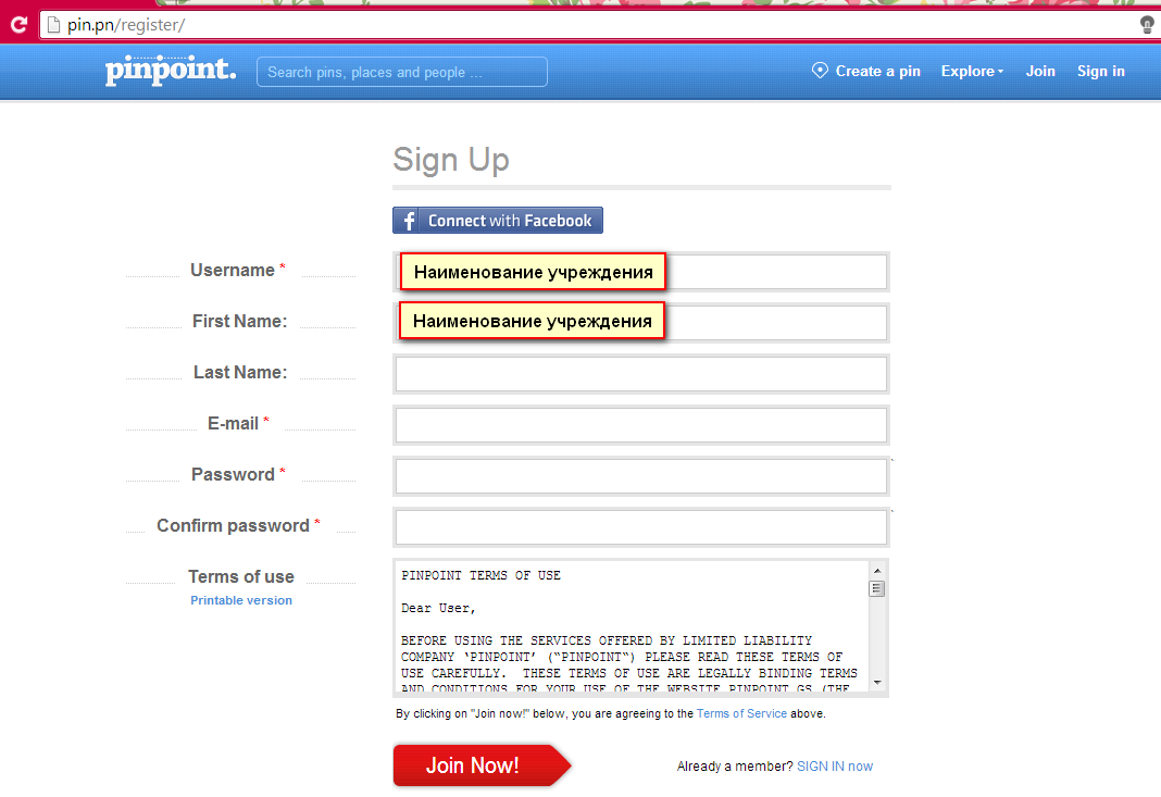 Заполните поля, отмеченные звездочкой. В полях “ Username” и “ First Name” Вам следует ввести наименование своего учреждения. И нажмите кнопку “ Join Now ”.