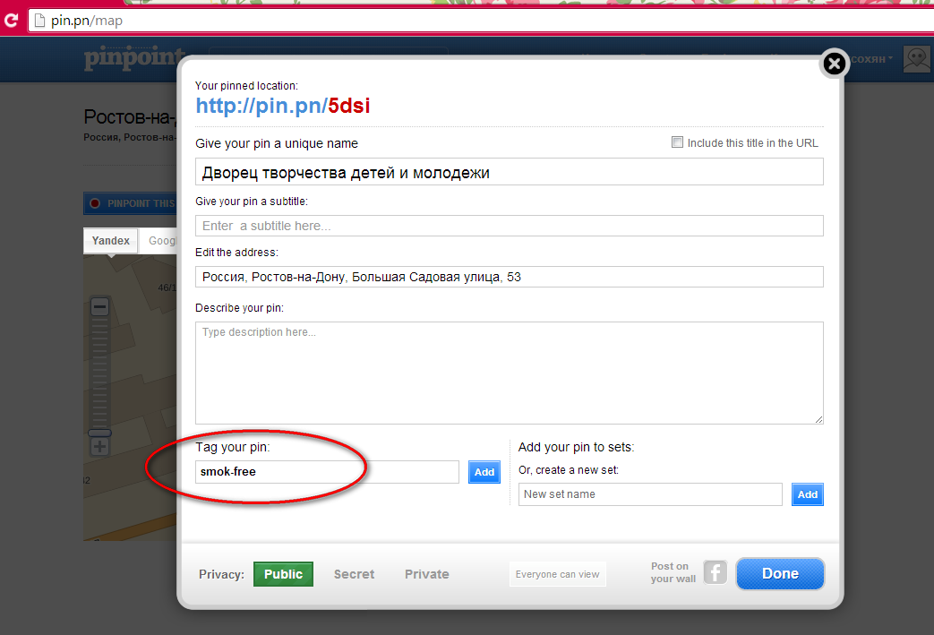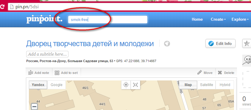 6. После того, как появится метка на карте, нажмите на нее два раза, чтобы появилось окно, где следует заполнить подробную информацию об этом месте. Заполните форму, в поле “ Tag your pin ” введите название тэга «smoke-free».