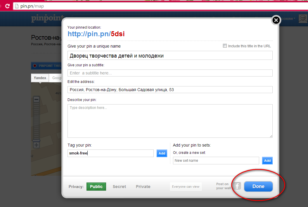 После того, как Вы указали название учреждения, адрес и тэг. Нажмите кнопку “ Done ”.