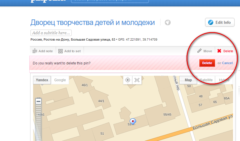 Если Вы хотите удалить метку, для этого Вам нужно нажать в правом верхнем углу карты на кнопку “ Delete ” и подтвердить свое действие нажатием на красную кнопку «Delete».