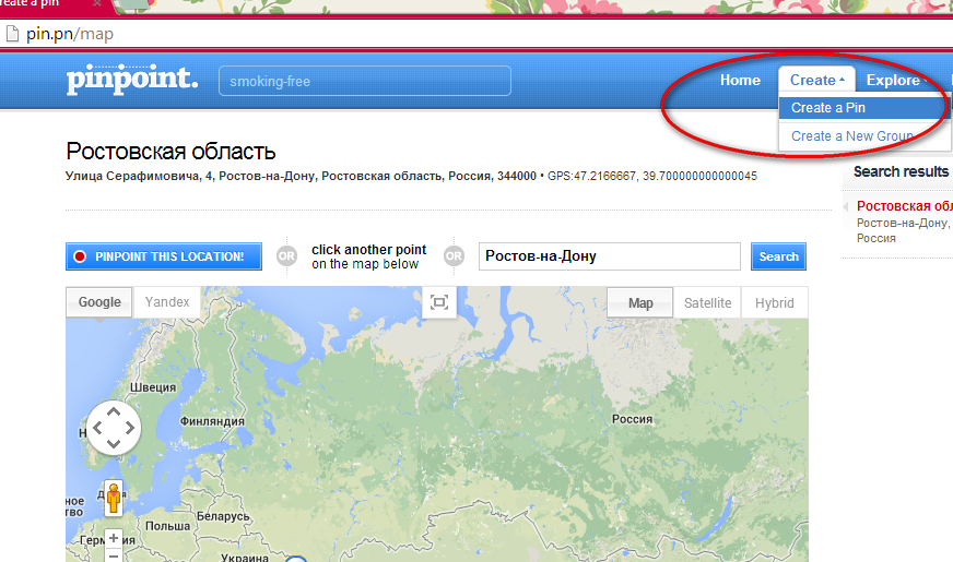 Чтобы создавать новые метки, достаточно в правом верхнем углу страницы выбрать меню “ Create ” и выбрать пункт “ Create a Pin ”.