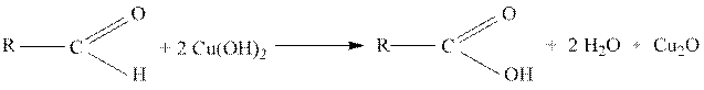 В пробирку наливают 0,5 мл формалина или уксусного альдегида, 3 – 4 мл 2 н. раствора гидроксида натрия и по каплям добавляют раствор медного купороса до появления мути. При нагревании верхней части пробирки наблюдается появление желтого осадка, переходящего в красный, при образовании оксида меди (I):