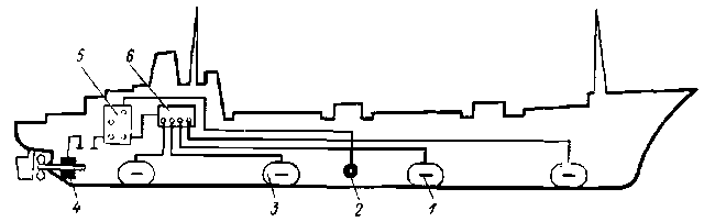 При катодной защите электродный потенциал в морской воде изменяют наложением электрического тока от внешнего источника. Принцип работы катодной защиты можно рассмотреть по схеме, указанной на рис. 151. От источника питания 5 постоянный ток напряжением 12-24 В через распределительные щиты 6 подается к анодным узлам 1. Вокруг анода в пределах 2-3 м располагается околоанодный экран 3, который служит для уменьшения пиковых значений электродных потенциалов вблизи анодов. Схема предусматривает установку одного или нескольких электродов сравнения 2, которые выполняют функции датчиков. Имея собственный постоянный электродный потенциал, они улавливают сдвиг потенциала защищаемой конструкции от стационарного и подают сигнал на регулирующее устройство плотности тока. Аноды изготовляются из графита, алюминия и его сплавов, свинцово-серебряного сплава, платины и других материалов и крепятся к корпусу судна через диэлектрик. Околоанодные экраны чаще выполняются из стеклопластикового покрытия, которое наформовывается на корпус судна. Используя катодную защиту, необходимо предусмотреть установку токосъемного устройства 4, описанного выше. При очередном доковании судна следует осмотреть все элементы катодной защиты и результаты внести в доковый акт. При механической очистке корпуса судна следить, чтобы не повредить аноды.