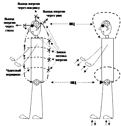 У нездорового человека после всплеска идет сброс энергии на всех проблемных уровнях (штриховая линия), где есть блок-патология, в область малого таза. Справа – показаны потоки энергии во время выполнения упражнения «Сухой тибетский массаж». ВЦ – верхний центр. НЦ – нижний центр.