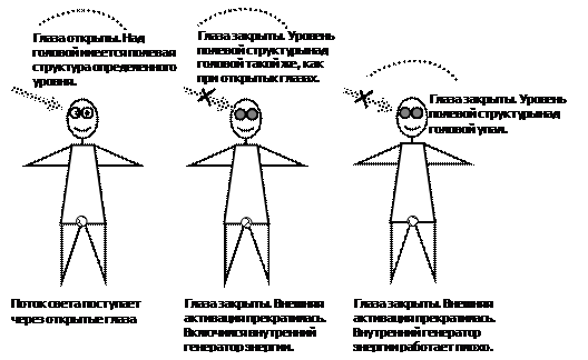 Те, кто проходил первую ступень, помнит, что в конце занятий перед тем, как включать экран внутреннего видения, мы проводим тест на включение гомеостатического механизма (рис. 21). Какого? О котором мы только что говорили. Наши глаза открыты. В этот момент наш мозг работает с определенной активностью, и над головой есть излучение, есть определенная полевая структура, напряженность. Мы закрыли глаза. Если у нас мгновенно не включился внутренний генератор, не пошел поток энергии в голову, то идет падение напряженности, идет падение поля. Это говорит о том, что внутренний источник питания пока еще слабый. Можно подержать руку над головой тестируемого. Через некоторое время внутренний источник включается, энергия начинает поступать в голову, и поле над головой может расти. Это говорит о том, что генератор все-таки заработал. Пусть еще плохо, но заработал. Открыли глаза, и сразу пошел рост поля вверх.