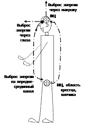 Рис. 22. Существуют три основные разновидности «Всплеска»: «Всплеск» с выбросом энергии через глаза, макушку и на передне-срединный меридиан.