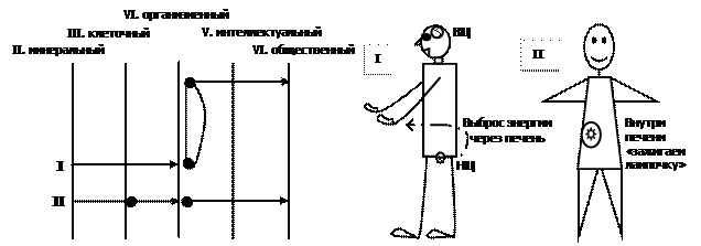 «Всплеск» в другие органы можно делать в двух вариантах. Почему? Вспомните уровни плотного тела – минеральный, клеточный, организменный, интеллектуальный и общественный, со второго по шестой (рис. 23). Идет энергия, доходит до организменного уровня и на нем пошла от копчика к голове. На организменном уровне мы улавливаем кусочек потока энергии. Это один вид «Всплеска».