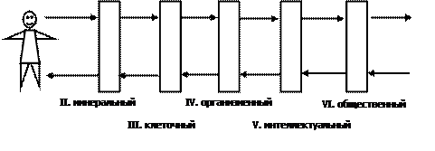 Четвертая схема – пять уровней плотного тела (рис. 32). Минеральный, клеточный, организменный, интеллектуальный и общественный. Не всегда наши проблемы связаны именно с организменным уровнем. По схеме можно провести самодиагностику (а на каком уровне у меня возникли проблемы?) и гармонизировать перетекание энергии по уровням. Энергия должна перетекать через все уровни в обе стороны. Эта схема хороша, к примеру, для тех, кто полнеет, несмотря на то, что ничего не ест. А все потому, что где-то между уровнями энергия нормально не проходит. Стоит плотина, и энергия скапливается. Необходимо делать скользящие движения рукой сквозь все уровни, чтобы убрать препятствия. Одновременно можно почувствовать, как работают все уровни (в течение дня все время идет динамика).