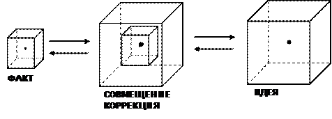 Седьмая схема. Кубик. Работа с идеей (рис. 35). Это перепрограммирование самого себя. На схеме два кубика. Маленький кубик слева – это факт, фактическое состояние дел. Большой кубик справа – идеальное состояние. В середине – совмещение, коррекция.