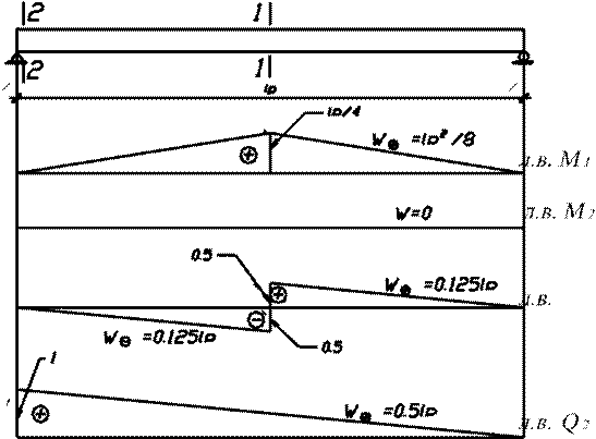Рисунок 2.2 – Схема расположения расчетных сечений и линий влияний Q и М: W+- площадь линии влияния одного знака