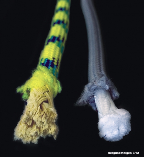 Рис. 2. Репшнуры с сердцевиной из кевлара (слева) и дайнемы (справа). Оплетка обоих шнуров – из нейлона.