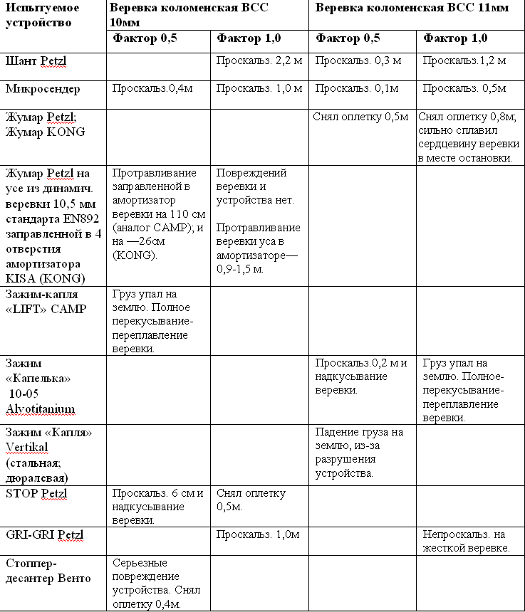 В испытаниях при рывках без амортизатора уже при факторе 0,5 он снял оплетку с основной веревки на участке 0,45 м, тем самым погасив рывок. При факторе 1 снятие оплетки произошло уже на интервале 0,8 м и в конце его произошло сплавление и оплетки, и частично сердцевины веревки. Однако, груз оставался висеть, т.е. рывки жумар выдержал.