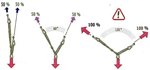 При увеличении угла между точками страховки – нагрузка на точки возрастает (см.рис.1)