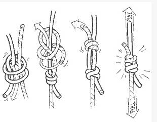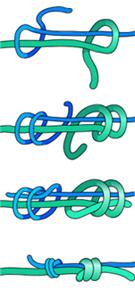 Узел состоит из двух полуузлов, завязываемых последовательно концами правой и левой веревок (рабочие концы по 10—20 см). При завязывании полуузла работает только конец одной веревки.