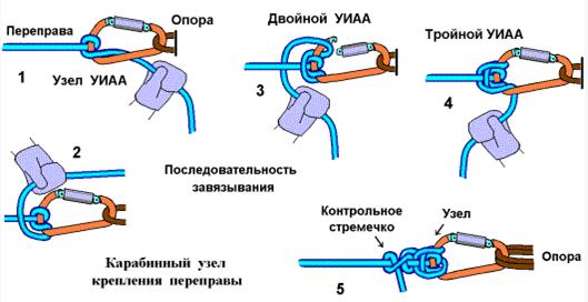 Карабинный узел крепления переправы (Тройной УИАА): Вяжется на карабине пристегивания переправы к точке на целевом берегу.