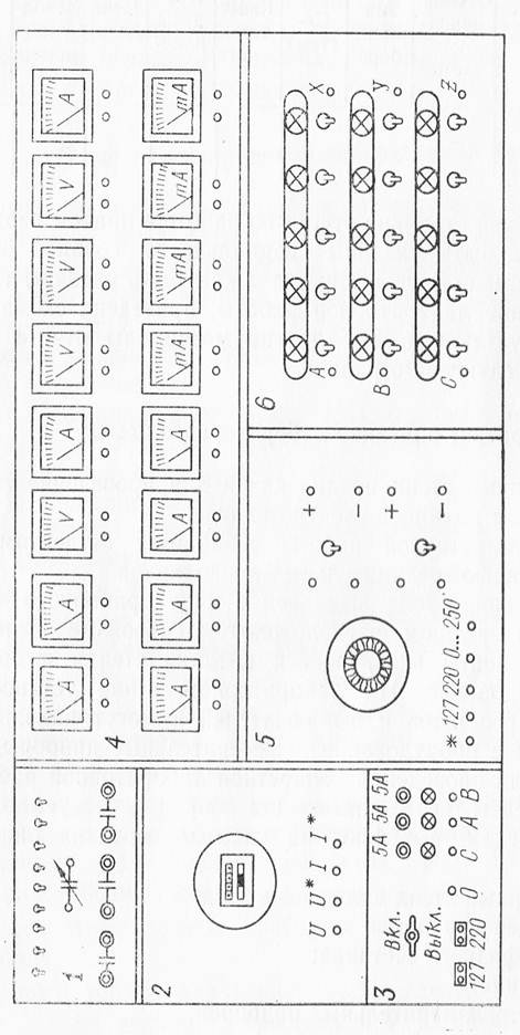| Рис. 1 Общий вид приборного щита 1-блок конденсаторов; 2-блок однофазного счетчика; 3-блок питания; 4-блок измерительных приборов; 5-блок выпрямителя и лабораторного автотрансформатора (ЛАТР); 6-блок ламп накаливания |