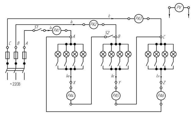 Рис. 4.1. Принципиальная электрическая схема для исследования трехфазной системы нагрузок, соединенных треугольником