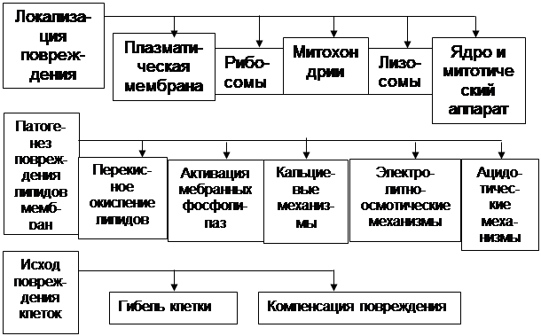 | 2. Изучить: а) изменения в клетке при лёгкой, средней и тяжёлой степени повреждения; | 2. В виде схем показать: а) механизмы развития морфологических и функциональных нарушений, причины дисбаланса ионов и воды, последствия, изменения мембранного потенциала клетки, последствия. |