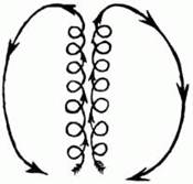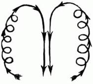 2. Ученик стоит лицом к Учителю. Учитель делает энергичные вихреобразные пасы-взмахи руками снизу вверх по оси тела Ученика. Когда руки Учителя приходят в верхнее положение, он опускает их вниз через стороны широким движением без вихрей. Повторить 10-12 раз.
