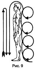 3. Учитель стоит с левого бока Ученика. Расположив правую ладонь сзади, левую (экран) спереди Ученика на расстоянии 10-15 см и поднимая обе руки параллельно, повторяет плещущие движения. Дойдя до головы, переводит правую руку вперёд и плавно опускает обе руки. Повторяет движения 5-6 раз (рис. 9).