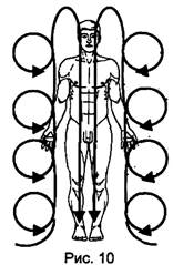 4. Учитель ¾ лицом к Ученику. Подтаскивающими движениями обеих рук поднимает энергию по бокам Ученика к плечам, заводит руки за его шею и, переведя энергию через голову Ученика, опускает их (рис. 10). Повторяет движение 5-6 раз.