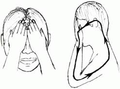 Ладони закрывают глаза. Глаза открыты и смотрят в тёплую темноту. Сформируйте энергетический шарик в районе шеи. Перемещайте шарик в Глову. В середине головы шарик разделяется на два шарика и они расходятся влево и вправо. Одновременно шарики движутся в глаза ¾ левый шарик в левый глаз, правый ¾ в правый. Не останавливаясь, выходят из глаз в ладони, из ладоней по рукам движутся в плечи, из плеч в шею. В шее шарики сливаются в один. Он поднимается в голову. Цикл повторяется.