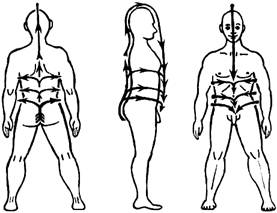 8. Помассировав обеими руками область копчика, на вдохе захватить ощущение энергии и как бы собрать её в ладони в две чаши. Затем, продолжая вдох, поднять ладони вдоль позвоночника на максимально возможный уровень (до лопаток), перебросить руки через верх за спину и продолжать подъём до макушки. Всё это делается на вдохе. То есть надо на вдохе поднимать энергию руками по заднесрединному меридиану. От макушки на выдохе опустить ладони к гениталиям. То есть ладонями опустить энергию по переднесрединному меридиану. Повторить 5-10 раз.