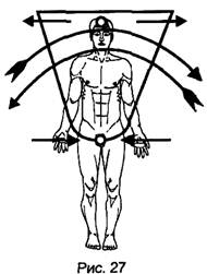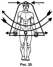 "Колокол" направлен вверх: вершина его находится в центре промежности, основание вверху. Почувствовав вершину "колокола", захватить ощущение сектора поля вокруг головы, медленно перемещать его руками вперёд ¾ назад, вправо ¾ влево, полукругом.