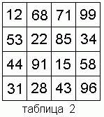 Учитель заранее сделал таблицу на бумаге. Таблица заполняется двузначными числами. Числа берутся произвольно. Получилась таблица 2.
