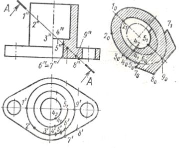 1. На главном изображении обозначают все точки, в которых линия пересечения А-А пересекает очерковые линии наружных и внутренних поверхностей предмета, а также осевые линии изображений (точки 1״, 2״,…8״, 9״). Точки отмечаем на передней части предмета, учитывая его симметричность относительно фронтальной плоскости, проходящей через ось цилиндрических поверхностей предмета. Сечение будет симметрично относительно линии 1090.