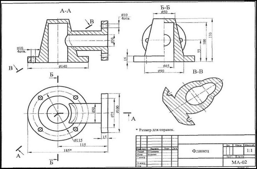 После построения трех видов нужно выполнить разрезы. При заданных формах предмета потребуется выполнить три разреза: горизонтальный, фронтальный и профильный. Правила обозначения и изображения разрезов должны соответствовать ГОСТу 2.305-68. При симметричных изображениях следует обязательно соединить половину разреза с половиной вида.