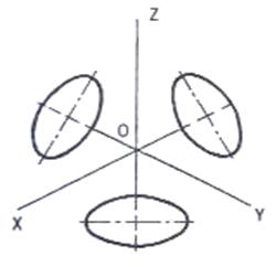 Большие оси эллипсов расположены под углом 900 к той оси, которая в данной плоскости отсутствует. Например, в плоскости XOY перпендикулярно оси Z, в плоскости XOZ – оси Y, в плоскости ZOY – оси X. (рисунок 2.11). Малые оси эллипсов расположены параллельно отсутствующим в данной плоскости аксонометрическим осям, т. е. перпендикулярно большим осям эллипсов.