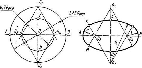 Построение эллипса можно выполнять в следующей последовательности: из точки О описывают две окружности диаметрами, равными осям эллипса, т.е. диаметр большой окружности будет равен 1,22*Dокр, а диаметр малой – 0,70* Dокр (рисунок 2.12). Отмечают точки О1,О2, О3, О4 – центры сопряженных дуг окружностей.