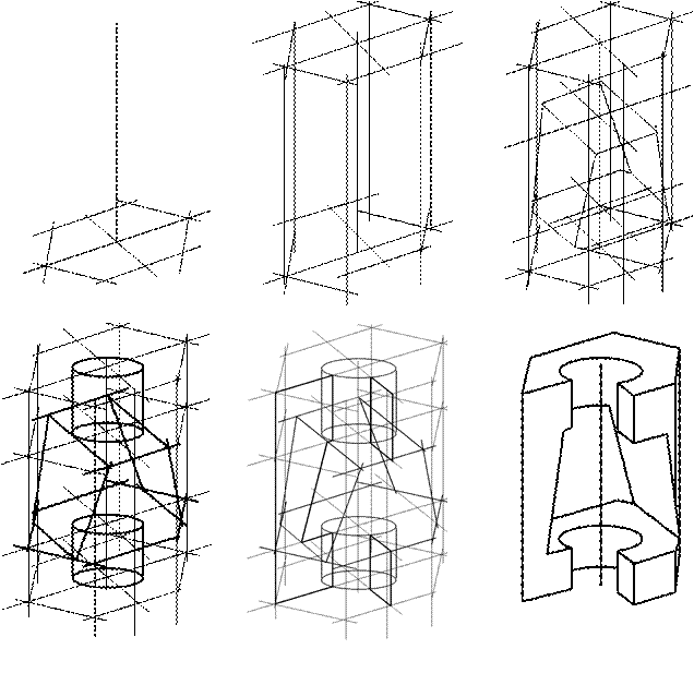 Выполнение задания требует мысленного представления предмета. Внимательно прочитав описание внешней формы предмета, следует представить этот предмет в пространстве. Затем мысленно выполнить в этом предмете два отверстия, данные в описании. После того, как будет уяснена конструкция предмета, следует приступать к выполнению чертежа.