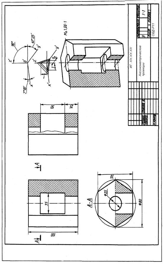 Заключительным этапом при выполнении графической работы является построение аксонометрической проекции предмета с вырезом одной четверти по ГОСТу 2.317-68. Построение начинают с проведения аксонометрических осей и изображения плоской фигуры основания, затем строят основные контуры детали, наносят линии уступов, углублений, выполняют отверстия в детали, показывают разрезы, обводят линии видимого контура до требуемой толщины (рисунок 2.13.).