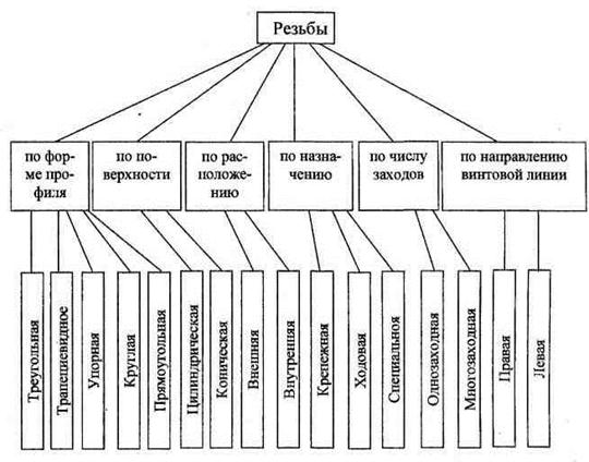 В технике широко распространены резьбы и резьбовые соединения. Классификация резьб приведена на рисунке 2.16. Основные элементы и параметры резьб, такие как профиль резьбы, угол профиля (a), шаг резьбы (P), ход резьбы (Ph), наружный и внутренний диаметры можно видеть на рисунке 2.17