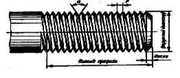 Границу нарезанного участка показывают сплошной толстой основной линией, которую проводят до линии наружного диаметра (рисунок 2.18,а). Границей нарезанного участка (конца резьбы) считают конец профиля резьбы, т.е. до начала сбега.