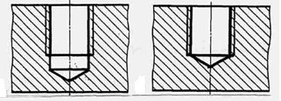 Ш т р и х о в к у в разрезах и сечениях доводят до сплошной толстой основной линии, т.е. до линии наружного диаметра на стержне или внутреннего диаметра резьбы в отверстии. Если отверстие с резьбой не сквозное, то его показывают как на рисунке 2.23,а. На чертежах, по которым резьбу не выполняют, конец глухого резьбового отверстия, даже при наличии разности между глубиной отверстия под резьбу и длиной резьбы, допускается изобразить, как на рисунке 2.23,б. Длина части глухого от