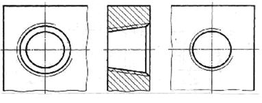 перпендикулярной к оси стержня или отверстия, условно не изображаются (рисунок 2.25). Делается это для того, чтобы сплошная основная линия окружности, изображающая один из диаметров фаски, не закрывала изображения резьбы. Но заметьте, что на изображениях, параллельных оси резьбы (и на видах и на разрезах), сплошная тонкая линия, изображающая один из диаметров резьбы, обязательно должна пересекать фаску, как показано на рисунке 2.25. При этом на стержне меньший диаметр фаски меньше внутреннего диаметра резьбы, и наоборот, в отверстии большой диаметр фаски больше наружного диаметра резьбы. Для наглядности эти места на чертеже показаны в кружках в увеличенном масштабе. Коническую резьбу изображают по тем же правилам, что и цилиндрическую (рисунок 2.26а,б).Чтобы определить внутренний диаметр резьбы (для вычерчивания), нужно ее наружный диаметр умножить на 0,85, т.е. d1=0,85d. При необходимой точности размер внутреннего диаметра резьбы берут из соответствующего стандарта. Резьбу с нестандартным профилем показывают со всеми необходимыми размерами и