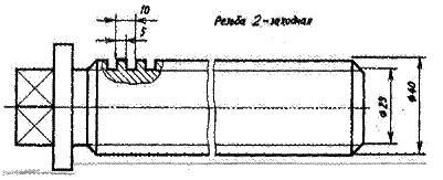 С б е г р е з ь б ы — это длина участка неполного профиля в зоне перехода от резьбы к гладкой части детали (рисунок 2.19,б). Обычно резьбу изображают без сбега (рисунок 2.19,а). Если нужно показать сбег, то его изображают сплошной тонкой наклонной линией, идущей за пределами границы резьбы. Эта линия, наклонна к оси стержня (рисунок 2.19 б,в). Сбег показывают, когда нужно нанести его размер (рисунок 2.19,в) или размер резьбы со сбегом. (рисунок 2.19,б). Когда резьбу на стержне изображают в разрезе, границу нарезанного участка наносят штриховой линией (рисунок 2.20).