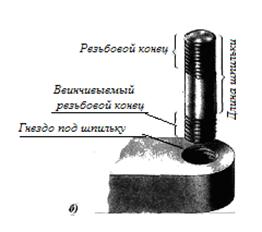 Шпильки. Шпилькой называется крепежная деталь, представляющая собой цилиндрический стержень, имеющий с двух сторон резьбу (риунок 2.31). На шпильках нарезается метрическая резьба. Шпильки применяют для соединения деталей, когда отсутствует место для размещения головки болта или гайки, а также когда одна из соединяемых деталей имеет значительную толщину, что делает не экономным установку болта большой длины.