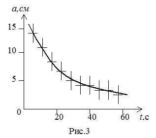 На Рис.3 представлен вид зависимости амплитуды затухающего колебания от времени. Здесь А = t (с), Z = a (см). Точками показаны полученные результаты, вертикальными отрезками – разброс в значении функции, горизонтальными – аргумента.