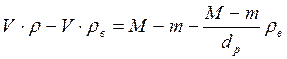 Здесь ρ ` – плотность дистиллированной воды при данной температуре. Для учета поправки на воздух введем следующие обозначения: V– суммарный объем кусочков твердого тела, ρ – их истинная плотность, ρ в – плотность воздуха, ρ p – плотность разновесок. Тогда (V ρ) – истинная масса кусочков исследуемого тела, (V ρ `) – истинная масса вытесненной ими воды, (V ρ в) – масса воздуха, вытесненного кусочками твердого тела или водой в том же объеме; (m / ρ р) ρ в – масса воздуха, вытесненного разновесками, уравновешивающими кусочки;
